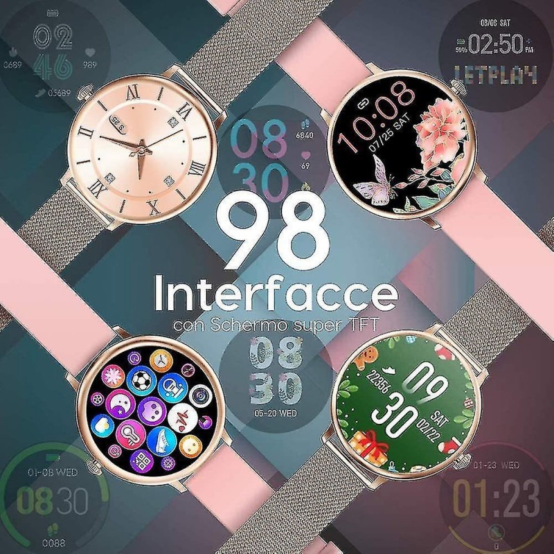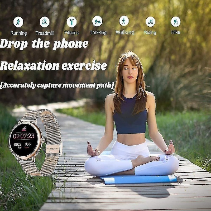 Reloj inteligente con pantalla táctil completa a prueba de agua El aspecto elegante de este reloj inteligente con pantalla táctil es el mejor regalo para mujeres, medición de frecuencia cardíaca, presión arterial, monitoreo del sueño, ciclo fisiológico femenino, podómetro, kilómetros deportivos, consumo de calorías, fotografía de distancia, recordatorios de sedentarismo, muchos modos deportivos, etc. Impermeable, a prueba de sudor y a prueba de lluvia en la vida diaria. 8 modos deportivos y resistencia al agua IP67 Realiza un seguimiento de las actividades de todo el día, incluidos los pasos, la distancia y las calorías quemadas. 8 modos deportivos monitorean tus datos de movimiento para personalizar el ejercicio. Correr, andar en bicicleta, jugar al fútbol, etc. Podrás monitorizar tus brazadas en la piscina y usarlos bajo la ducha fría. Notificaciones y SMS Recibe llamadas, mensajes SMS y SNS, Facebook, WhatsApp, Twitter, Instagram, etc. Cuando recibes una notificación, el reloj vibra para recordártelo. Simplemente conecte la pulsera a su teléfono a través de la aplicación y configúrela en la aplicación. No se pierden llamadas ni mensajes. Monitor de frecuencia cardíaca y monitoreo del sueño Con sensores ópticos inteligentes incorporados, el rastreador de actividad monitorea su frecuencia cardíaca en tiempo real y detecta automáticamente su frecuencia cardíaca. Además, monitorea eficazmente la calidad de tu sueño y proporciona un análisis integral de la calidad del sueño para ayudarte a desarrollar un estilo de vida más saludable. Compatibilidad y otras características Este reloj es compatible con teléfonos inteligentes que utilicen iOS 9.0 / Android 4.4 o superior y Bluetooth 4.0 o superior. Este reloj también cuenta con alarma, cronómetro, control remoto de la cámara, pronóstico del tiempo y ajuste de brillo. (No compatible con iPad)